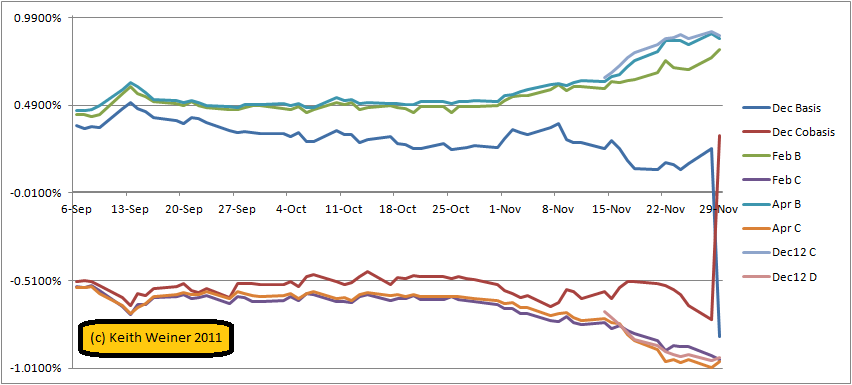 As a side note, the spread between the Dec 2011 contract and Feb 2012 contract also widened sharply. It had been falling since late October, accelerating in November.